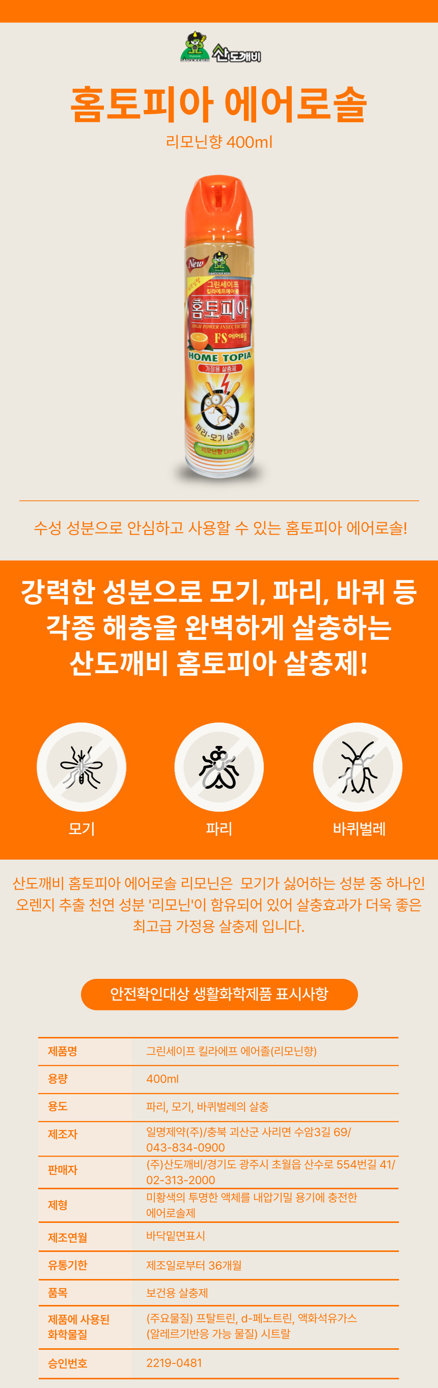 ■ 품명 및 모델명 : 홈토피아 모기 에어졸(리모닌/400ml)