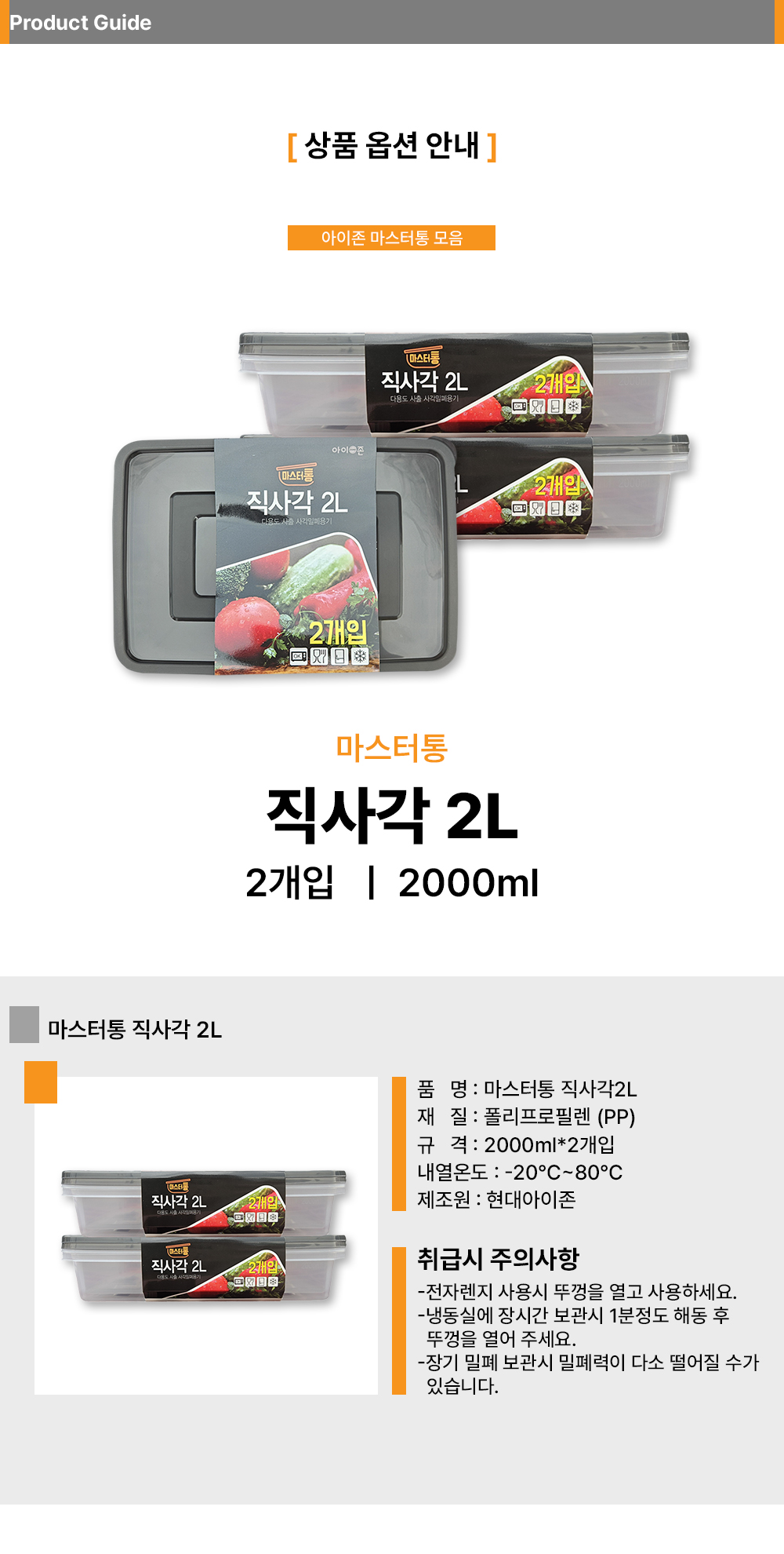 ■ 품명 및 모델명 : 밀폐용기 직사각 2리터 2p(2000ml/30*21*4.5cm)