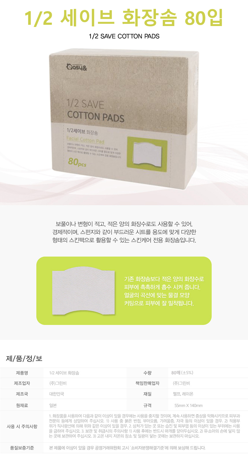 ■ 품명 및 모델명 : 1/2 세이브 화장솜 80입(20*20*20mm)